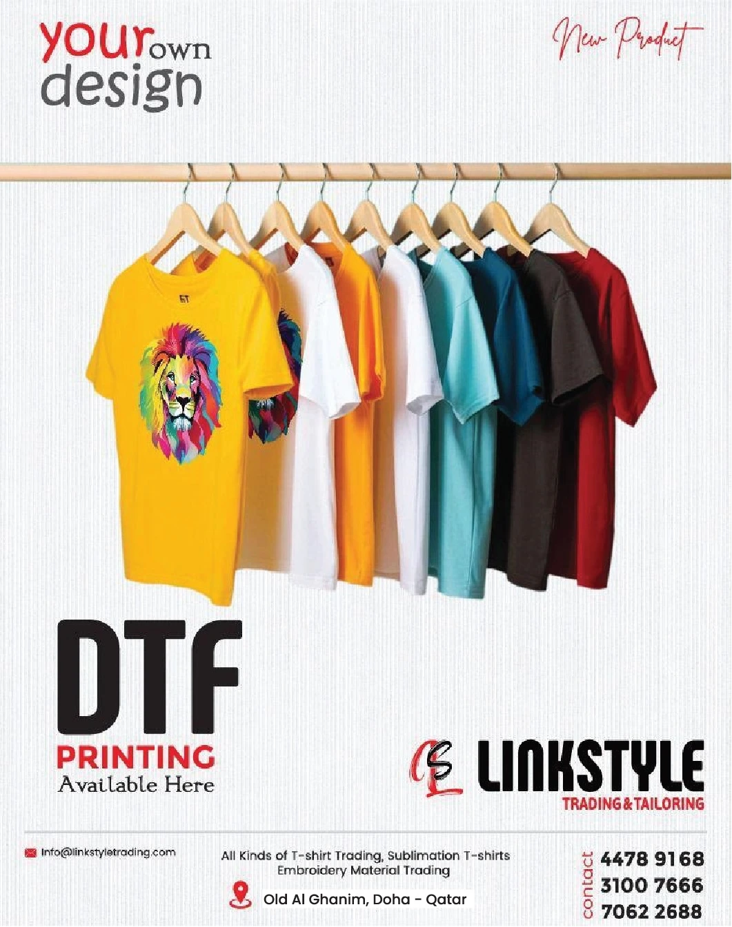 Call Us anytime +97461366499 Contact Us DTF Printing Our DTF printing base ensures vibrant, long-lasting designs on all types of fabrics. With precise color transfer and durable prints, we provide high-quality customization for uniforms and jerseys, giving a professional finish.
